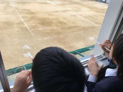今日の科学クラブでは、メスシリンダーで材料の量をはかり、シャボン液を作りました。その後はシャボン玉飛ばしを楽しみました。洗濯のりと砂糖を混ぜているのでいつもより割れにくく大きなシャボン玉ができたいたようです。