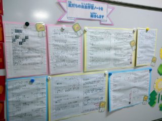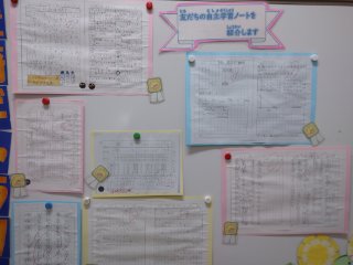 丁寧に書けているノートや、面白い内容でまとめられているノートをホワイトボードに貼っています。友だちのノートの良いところを見つけて、自分自身の取り組みの参考にしてみましょう。