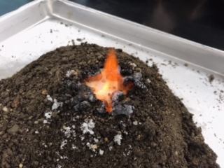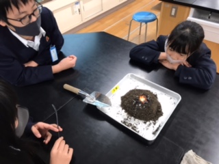 科学クラブで燃焼の実験をしました。砂糖と重曹を土の上にのせて火を着けてみると・・。子どもたちの予想とは異なり、生き物のようにニョキニョキと出てくる物が。物質の変化に興味いっぱいの子どもたちでした。