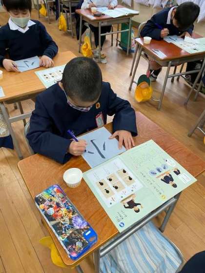 止め、はね、はらいに気をつけて「小」という字を書きました。乾いたら文字が消えるので、線の練習をしたり自分の名前を書いたりして、楽しんで学習することができました。