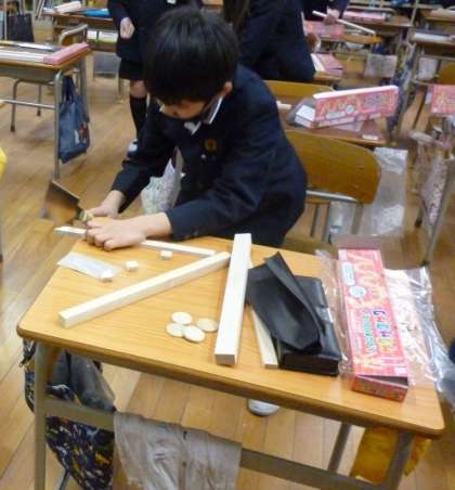 図工科で、のこぎりを使って木を切り、組み合わせてさまざまな形を作る学習を始めました。