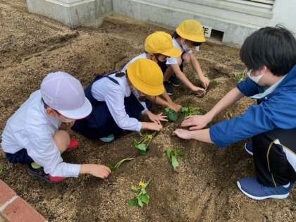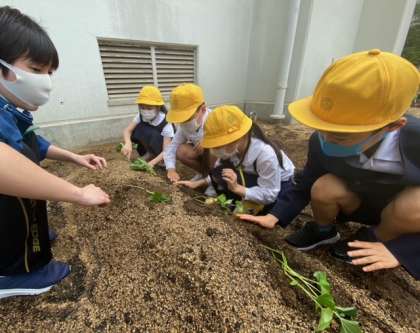 「えっ!横にうえるの?」と子どももびっくりしていました。穴を掘ったり、苗を植えたりして協力して植えて行くことができました。