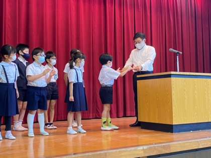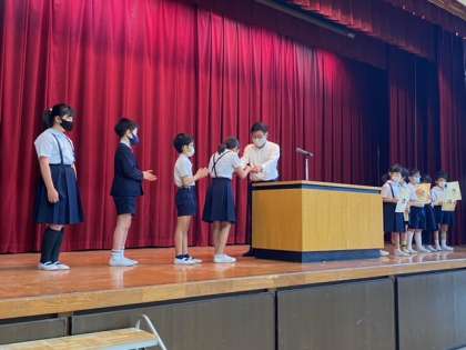 舞台の上で表彰されるのは少し緊張もするようですが、校長先生から賞状を直接渡してもらって嬉しそうでした。