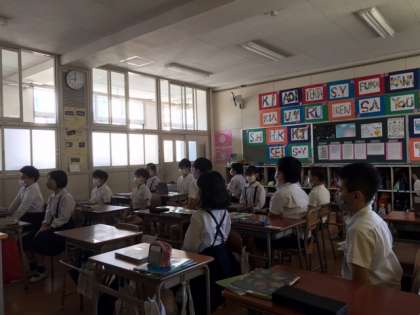 健康委員会が作った映像を観ながら姿勢を整えています。姿勢を意識できる時間が多くなるように頑張りましょう!