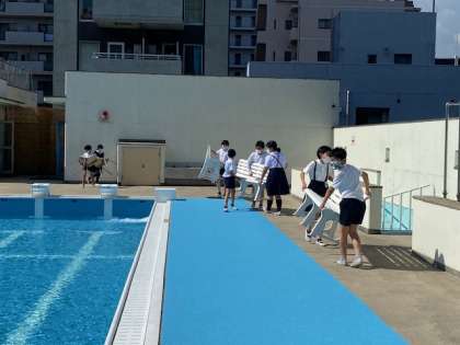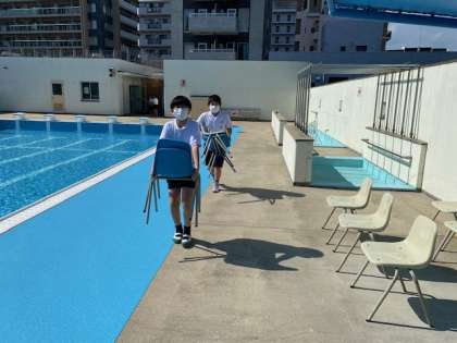 みんなが気持ちよくプールの学習をできるように、5、6生が中心になって更衣室や階段の掃除をしたり、必要な椅子などをプールまで運んでくれたりしました。
