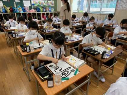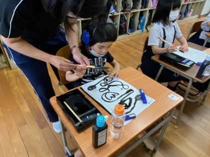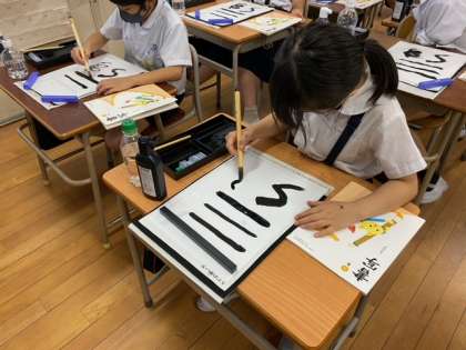 習字をするには色々な決まりがあるので、一つ一つ確認しながら進めていきました。墨をだすのもなんだかおそるおそるだしていました。どれぐらい筆に墨をつければいいのかも難しかったようです!普段の鉛筆で書く線とは全然ちがいます。色々難しいけど、みんな書いた後は「たのしいー♪」とニコニコ笑顔でした。