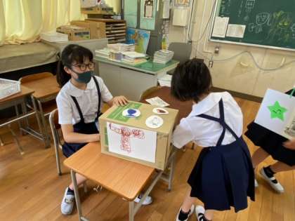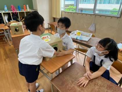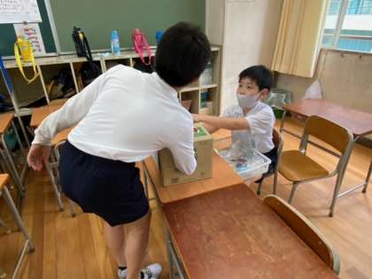 箱の中に手を入れて、箱の中身を当てていきます!低学年でもすぐに分かるものを考えていたのでみんなすぐに中身を当てて喜んでました。