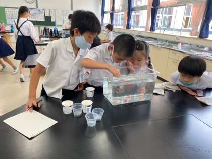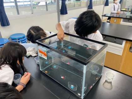 水槽の中にあるお皿にめがけてコイン落としをします。水の中ではユラユラと一円が揺れるのでなかなか狙った所に落とせず苦戦してました!