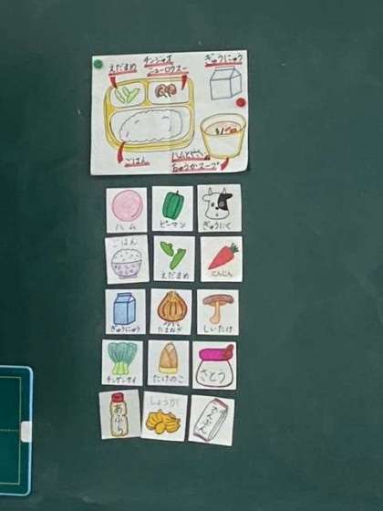 昨日の給食を振り返り、それぞれの食べ物の働きについて学しゅうしました。食べ物は主に赤色・黄色・緑色のグループに分かれることや、それぞれのグループでは役割がある事を学習しました。そして給食ではたくさんバランスよく栄養を取れることも分かりました。