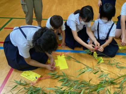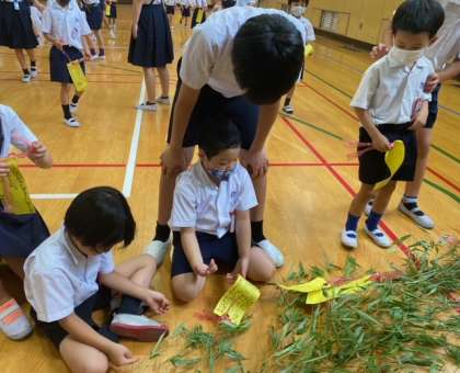1年生は笹に飾るのが少し難しいので、6年生が飾るのを手伝ってくれました。ぶじに飾る事ができてよかったですね。