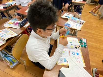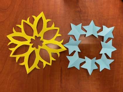 最初は切るところを間違えて、バラバラになってしまう人もいましたが、途中からはコツをつかんだようで、最後にはたくさん工夫した切り紙ができていました。