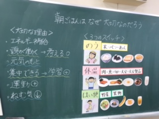 栄養教諭の先生をお迎えして、朝ごはんの大切さについて学びました。朝食を食べることで脳のスイッチが入り、体温も上がる等のメリットがあることに改めて気付きました。5年生ではほとんどの子どもたちが朝食を食べていますが引き続き、バランスの良い朝食を摂ることを大切にしてほしいと思います。