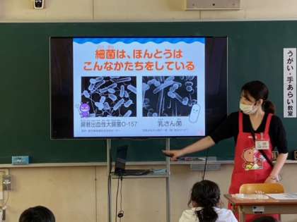 どうしてうがいや手あらいをしないといけないか、どんな時に手あらいをしなくてはいけないか1年生にも分かりやすく教えてくださりました。