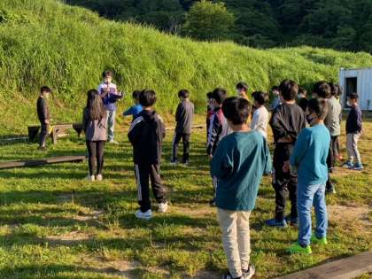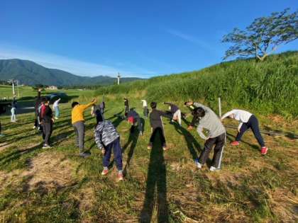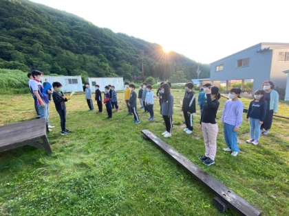 ?鳥の声がさえずる爽やかな天候の中、朝の集いが行われました。今日のプログラムの確認をしたり体操をしたりしました。