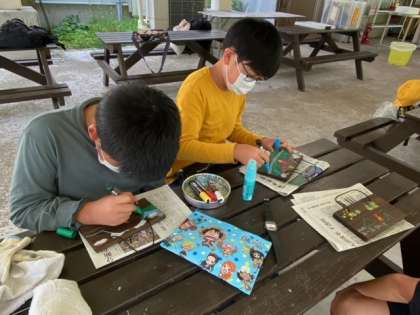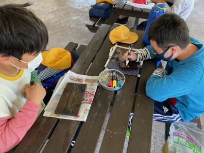 ?みんなピカピカに磨きあげた焼き板に絵を描いていきました。