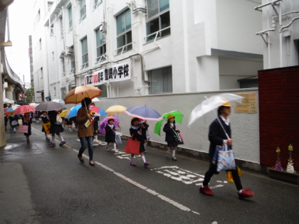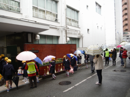 たくさんの「みまもりたい」の方々に付き添っていただいて,子どもたちは集団登校でやってきました。