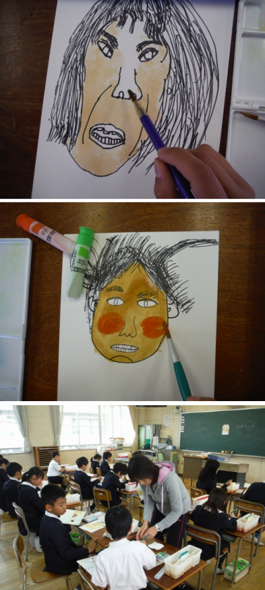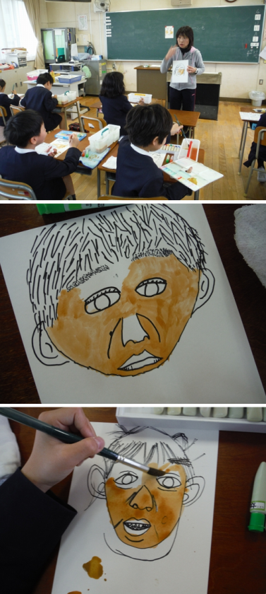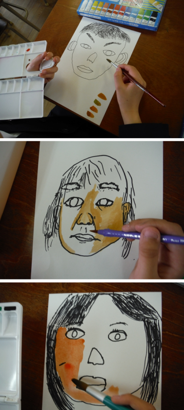 4年生最初の図画工作。今日は,自分の顔を鏡で見ながらペンで描いた自画像に,水彩絵の具で彩色しました。