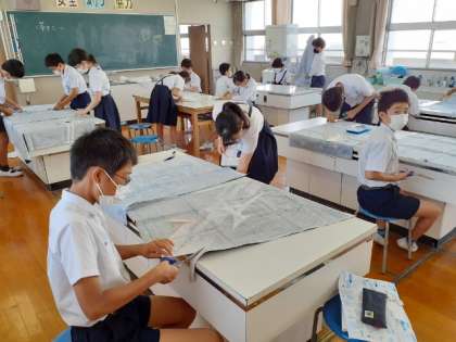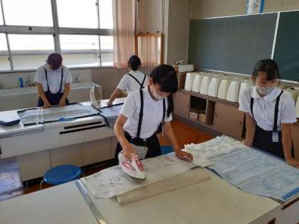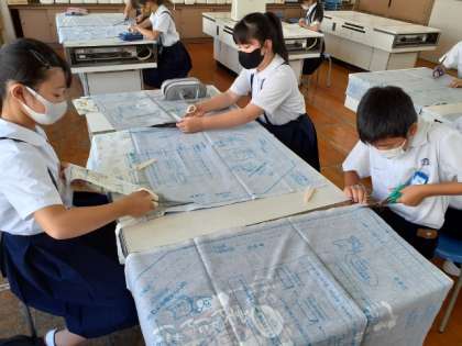 家庭科の学習で、エプロン作りに取り組んでいます。今回は、裁ちばさみで布を裁ち、しつけるためにアイロンをかける学習をしました。