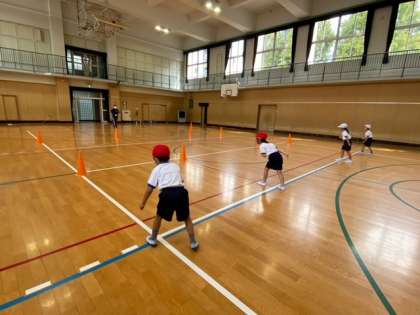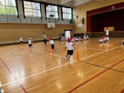 ただ走るだけじゃなく、コーンの周りを一周するなど色々な走りをして楽しくかけっこをしていきました。