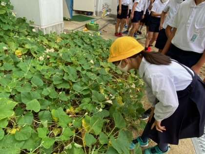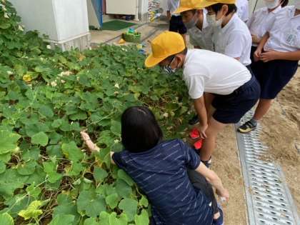5年生が学習園でヒョウタンの観察をしていました。受粉した花と受粉していない花の違いを確認していました。