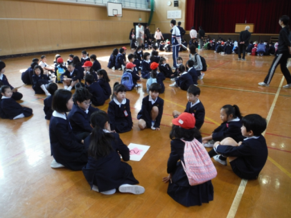 今日から児童集会がはじまります。1年生から6年生までのメンバーで構成した「たてわり班」の顔合わせをしました。