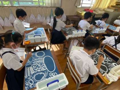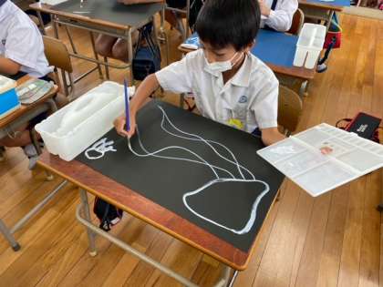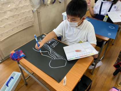 3年生は白の絵の具で、海の生き物のクラゲを画用紙に描いていきました。