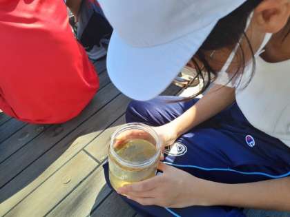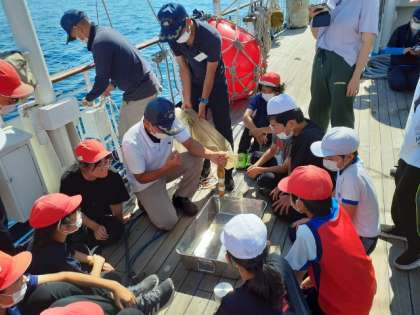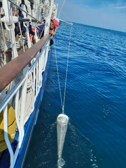 プランクトンネットをつかって、大阪湾に浮遊しているゴミについて調べました。