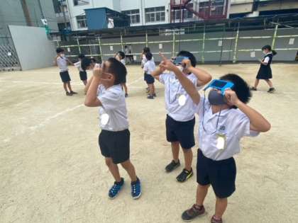 理科では「かげと太陽」の学習のをおこなっています。今日は遮光板を使って太陽を見る練習をしました。