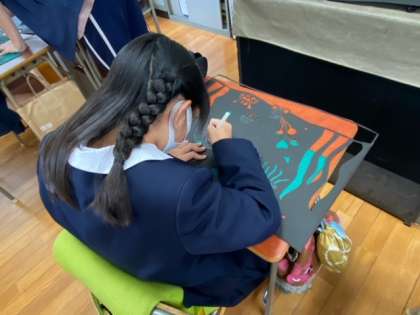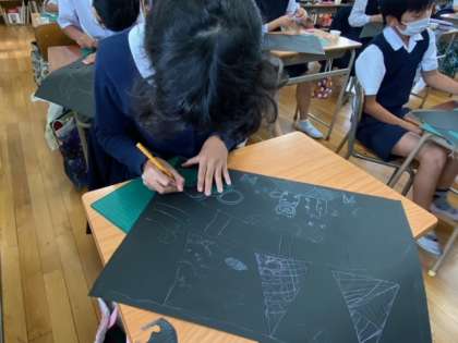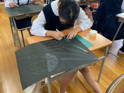 切り紙の本番の作品作りが始まりました。練習用と違って画用紙も大きくなり、作品作りも大変ですが、みんな集中して取り組んでいました。