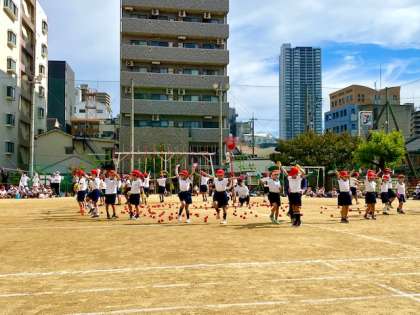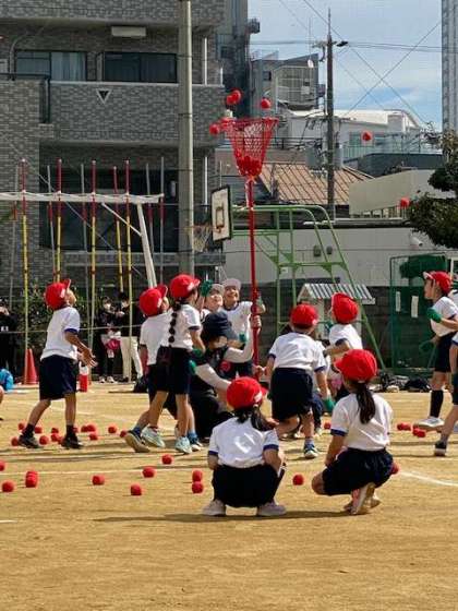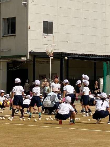 玉入れの前は音楽に合わせて可愛らしくダンスをおどっていました。音楽が止まるって自分のグループの色が呼ばれたら玉入れをしていきました。
