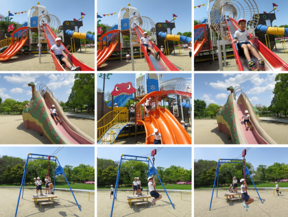 午後からは,お待ちかねの「恐竜広場」へ。海賊船のような遊具や,恐竜のすべり台,ターザンロープなどの遊具で思いっきり遊びました。