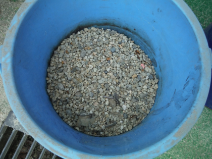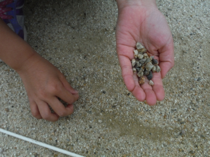 みんなで拾った石を集めると,バケツ2杯分になりました。