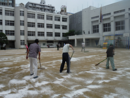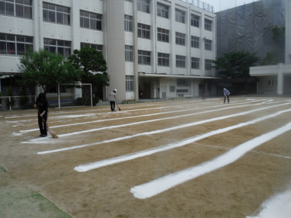 運動会を控え,運動場の砂が舞い上がらないように「にがり」をまきました。