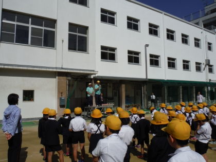 全校朝会のときに,登校中の安全を見守っていただいている北区役所地域安全防犯の「あんまち隊」の方に来ていただき,あいさつをしていただきました。