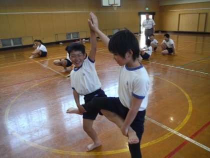 一人技,二人技,三人技…新しい技も加わりました。6年生は昨年度に練習していますが,初めての5年生もなかなかいい感じで技の習得が進んでいます。