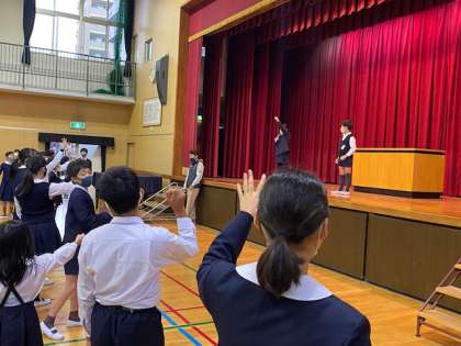 今日は「進化ゲーム」で集会委員の人とじゃんけんをしていきました。じゃんけんに勝てばカエルからどんどん進化していきます。途中ウサギやペンギンなどに進化して最後、人間になった人の勝ちです。