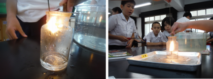 空気中には酸素が約21%だけ存在します。では,酸素中では,ろうそくや線香などがどのように燃えるか,二酸化炭素中で燃焼したものを入れたらどうなるか実験しました。