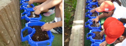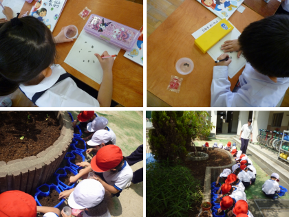 やさしく土に穴を空け,そっと種を入れた後、そっと土をかけました。
