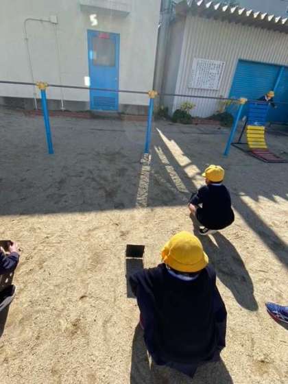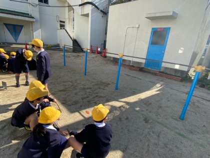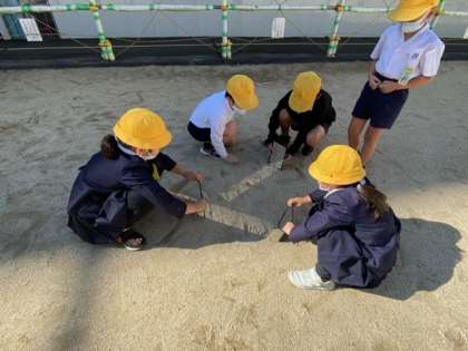 3年生が運動場で鏡をもって何やら実験を行っていました。
