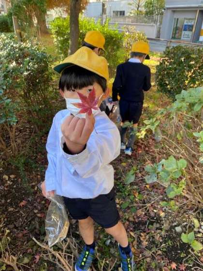 紅葉やイチョウの葉がきれいな色に色づいていたので、好きな色の落ち葉ひろいをしました。