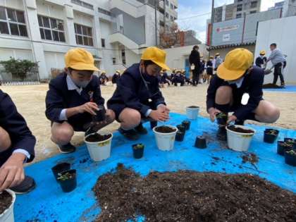 「花いっぱい運動」の最後は?5・6年生でした。5・6年生は今まで何度も植え替えをした事があるので、素早くパンジーの苗を植え替えする事ができました。