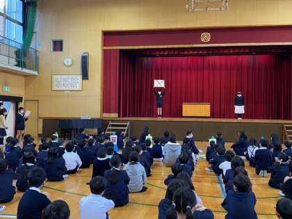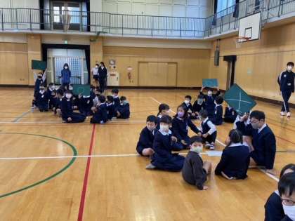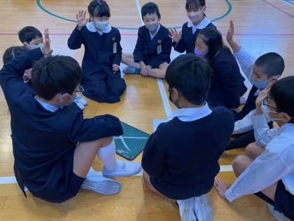 問題の答えが〇か×かグループで話し合って答えを決めていきました。学校に関する色々なクイズでした。