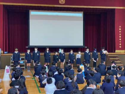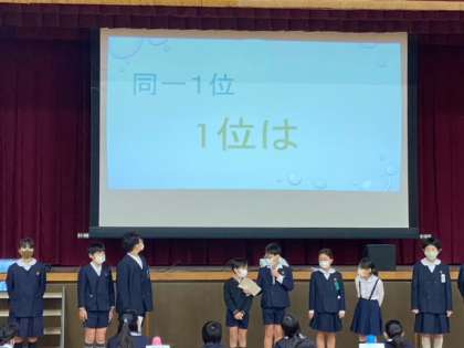 1年生から6年生までのリクエスト曲のアンケート結果の発表でした。自分達で作ったパワーポイントの資料を使っての発表です。どの学年も工夫されていて見やすい資料でした。