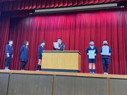 校長先生のお話と読書感想文コンクールの表彰と「ひとりひとこ」がありました。