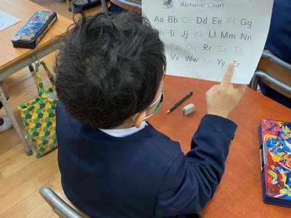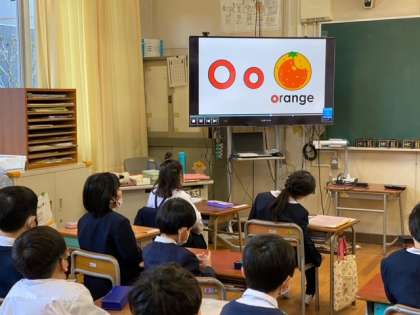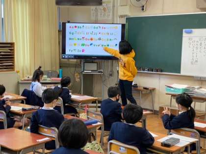 1年生はモジュール(英語学習)でアルファベットの学習をしていました。歌をうたったり、先生の言うアルファベットを指差ししたりして楽しく活動していました。