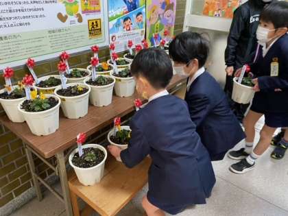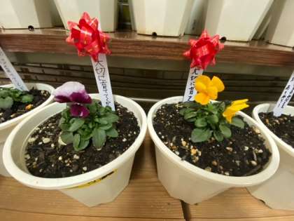 本日2月8日から3日間、子ども達が育てきたパンジーやビオラの鉢植えのプレゼントを行っています。