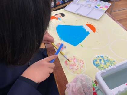 水で色を塗った上から絵の具をつけた筆をコンコンと軽く叩くと色がにじんで現れます。世界に一つしかないにじんでできたシャボン玉を嬉しそうに作っていました。