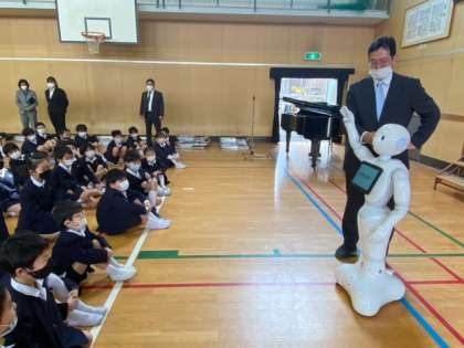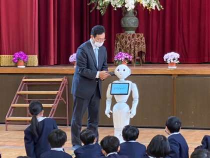 今日から豊崎小学校にさらにお友だちがふえました!ロボットのペッパーくんです。
