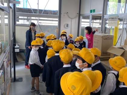 担任の先生に職員室や保健室など色々な教室を教えてもらいながら学校の中をいろいろ回っています。