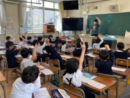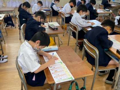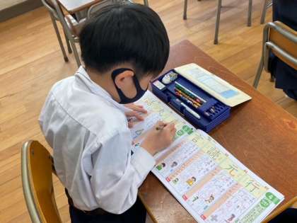 先生と一緒に空中で書き順の確認をしながら、新しい漢字の練習をしています。1つ1つしっかり覚えていきましょうね!